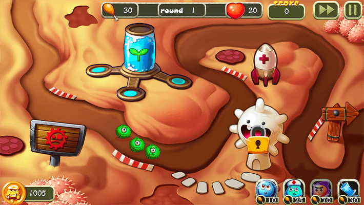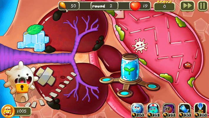 拥有各自风格特色的多种防御塔,有趣的细胞抗体造型和搞怪的病毒造型及名字大大地增加了游戏的趣味性。