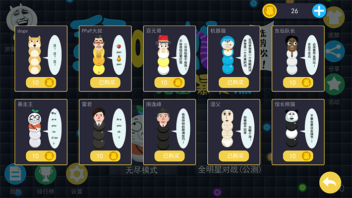 这款游戏是暴走游戏出品的趣味版贪吃蛇游戏,游戏中贪吃蛇以鬼畜的形式出现进行游戏,玩家们在游戏中可以享受到趣味性的游戏玩法,多种小蛇鬼畜行走,非常幽默搞笑,还等什么,加入鬼畜全明星阵容吧!